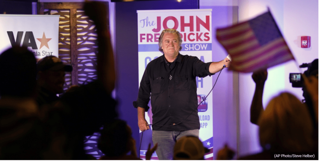 “Steve Bannon’s War Room is the most-watched and listened to live broadcast in America today,” he replied. “His total audience has surpassed 100 million downloads worldwide. I had the opportunity to be the founder of Steve’s War Room show two years ago. I was Trump’s chairman of his Virginia campaigns in 2016 and 2020 and got to know [Bannon] when he was chairman of the Trump campaign in 2016. He inspired me.”